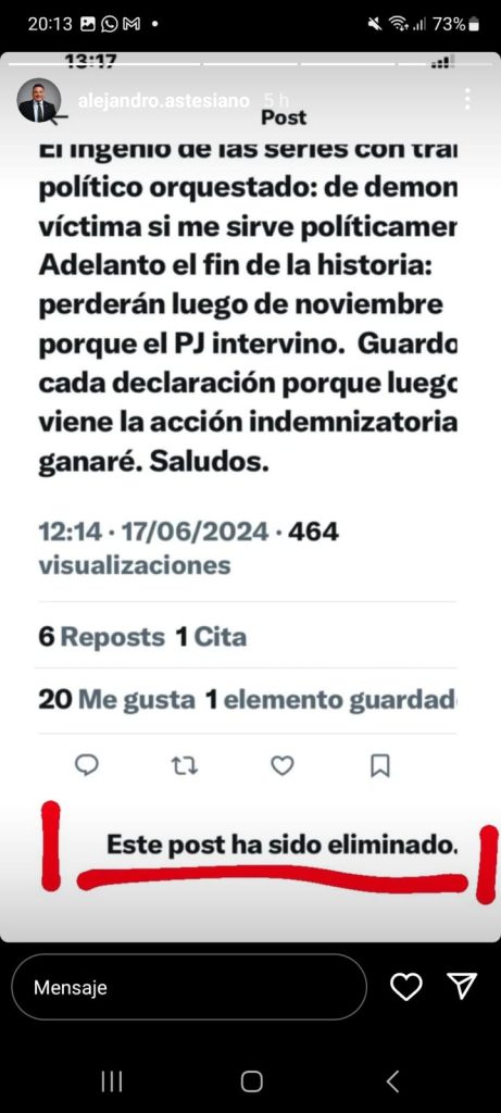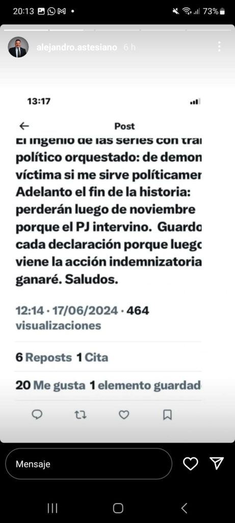 En ellos se puede leer: “El ingenio de las series con trabajo político orquestado: de demonio a víctima si me sirve políticamente. Adelanto el fin de la historia: perderán luego de noviembre porque el Poder Judicial intervino. Guardo cada declaración porque luego viene la acción indemnizatoria que ganaré. Saludos”.