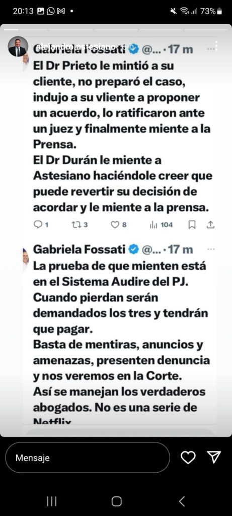 En ese marco, el propio Astesiano publicó en su cuenta de Instagram una serie de descargos que apuntan contra Fossati, quien, de acuerdo a Montevideo Portal, la exmagistrada posteó una serie de tuits que luego borró, relacionados al caso Astesiano.